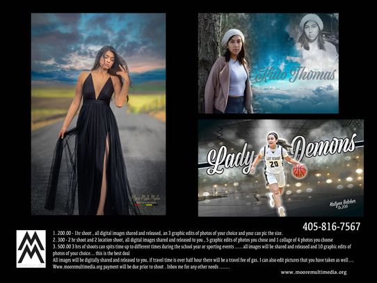 3. 500.00 3 hrs of shoots can spits time up to different times during the school year or sporting events ..... all images will be shared and released and 10 graphic edits of photos of your choice... this is the best deal